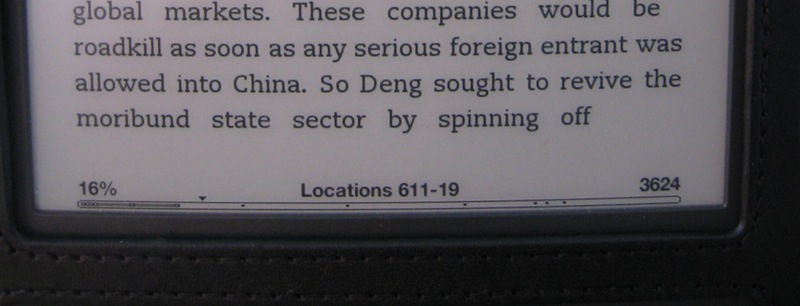 Unfortunately, the kindle UI team managed to snatch defeat from the jaws of victory. Because there actually is no space freed up, since while the pages and locations are gone, the percentage is still there (see below). Which is utterly pointless, since the shaded bar at the very bottom contains the same information (About where in the book am I?). Granted, the percentage is a little more exact – but not exact enough to find your place again – for that you would need the location number…