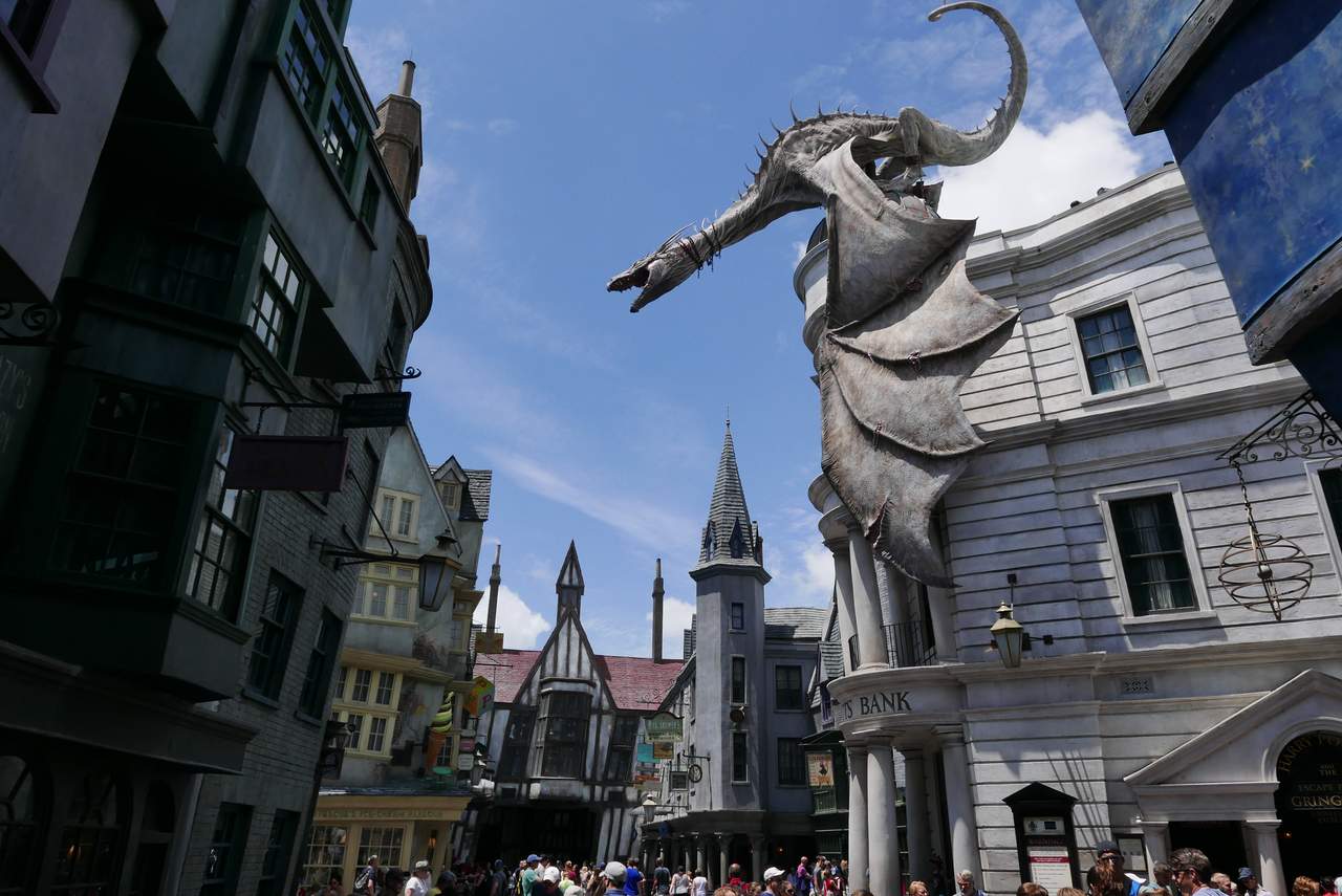 You pass through at platform 9 3/4 (google a video, if you want a spoiler), and find yourself in an extremly well done rendition of diagon alley. That dragon is sitting on top of Gringotts bank, and yes, it does breathe fire.