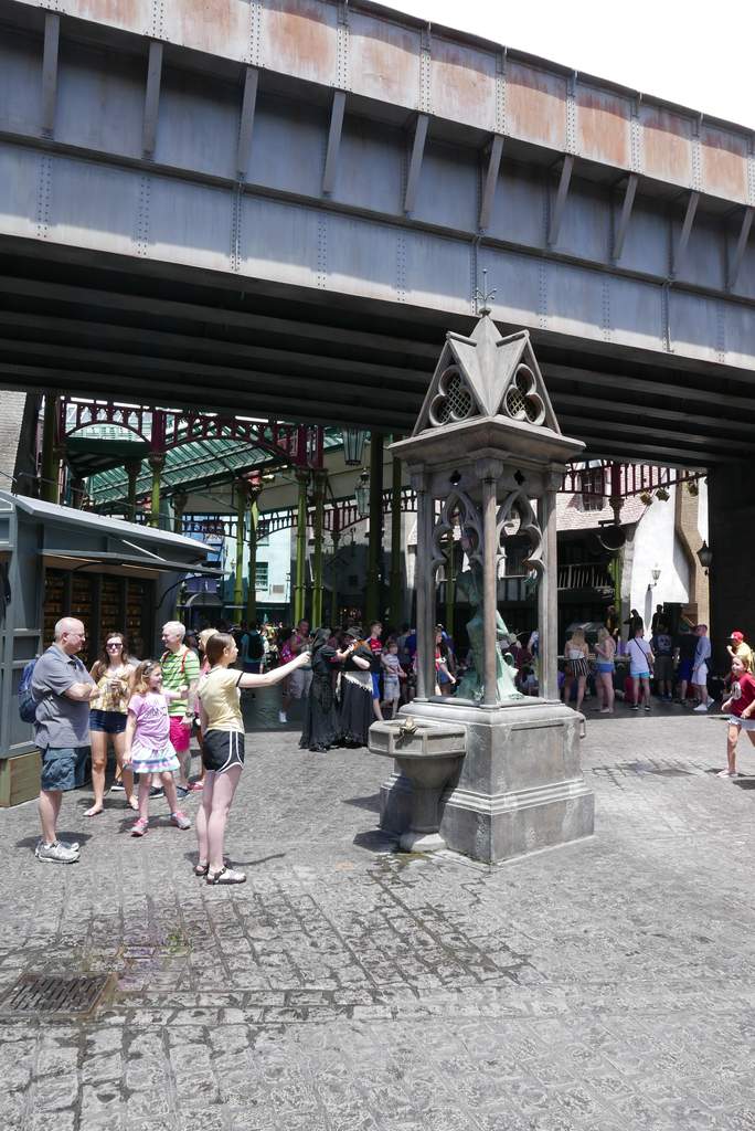 The girl in the picture is holding and waving her wand – there are lots of spots in the whole are (some clearly marked, some a bit hidden, some “secret”) where you can wave your wand and make “magic” happen (usually a puppet moving, a light going on etc). For which you have to of course buy a wand (in a convicing rendition of Ollivanders wand shop, where else), and of course that piece of plastic is fantastically overpriced, and activating the magic feature costs extra. But if I had come here as a kid, I would have absolutely loved it.